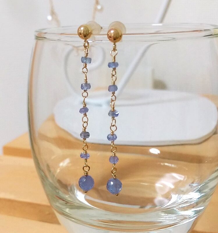 タンザナイトを14金ゴールドフィルドワイヤーでピアスにしました。