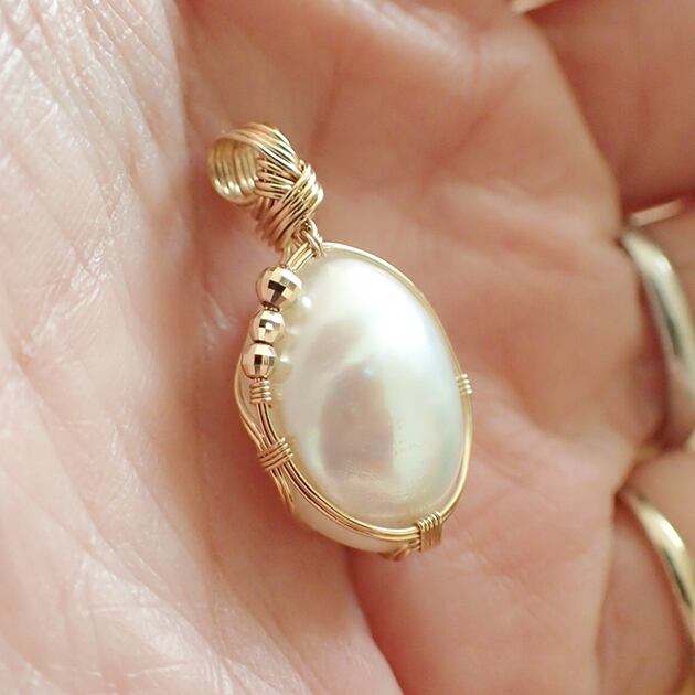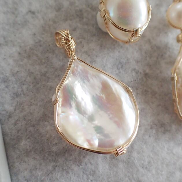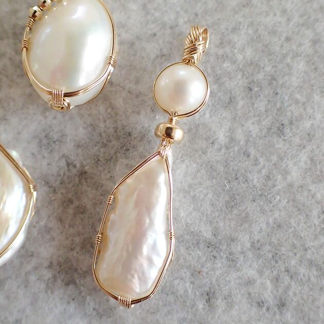 ・14金ゴールドフィルドワイヤー(商品により10Kビーズ、14kgfロンデルも)を使用しています。やわらかい素材ですので、硬い物にぶつけたり、強く押さえたりしないでください。