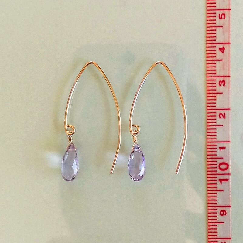 ドロップカットのローズアメジストを14金ゴールドフィルドワイヤーでピアスにしました。一粒石のシンプルさに、マーキース型のピアスフックが洗練された印象です。