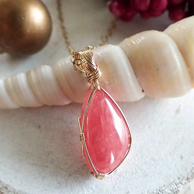 ご覧になってくださり、ありがとうございます。小粒いちごのように愛らしいロードクロサイト(インカローズ)を〈女神巻き®〉デザインでペンダントトップにお創りしました。