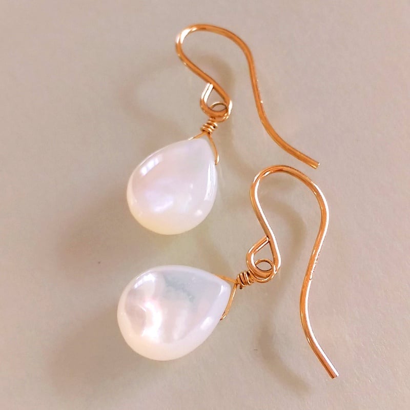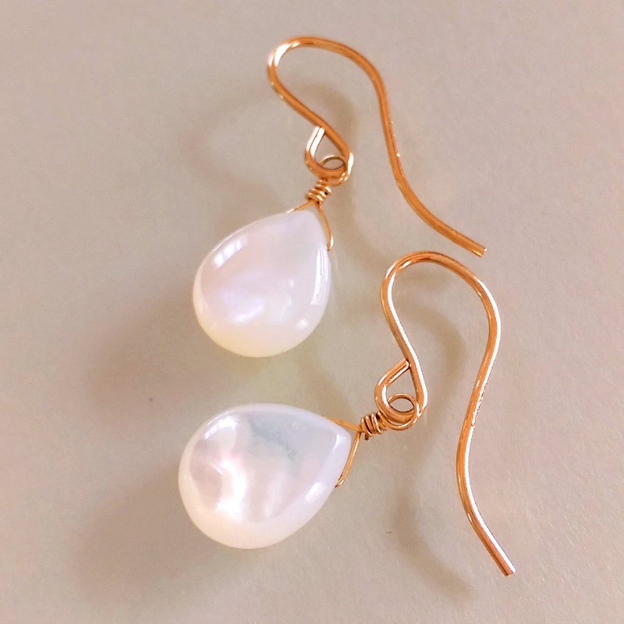 つややかなドロップ型のマザーオブパールを14金ゴールドフィルドワイヤーでピアスにしました。一粒のシンプルさと品の良い光沢が、清楚な印象です。