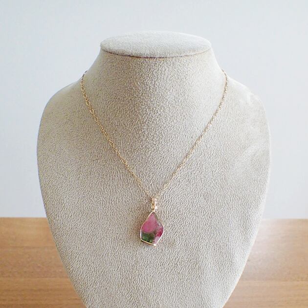 ウォーターメロントルマリンのスライス原石を〈女神巻き®〉デザインでペンダントトップにお創りしました。