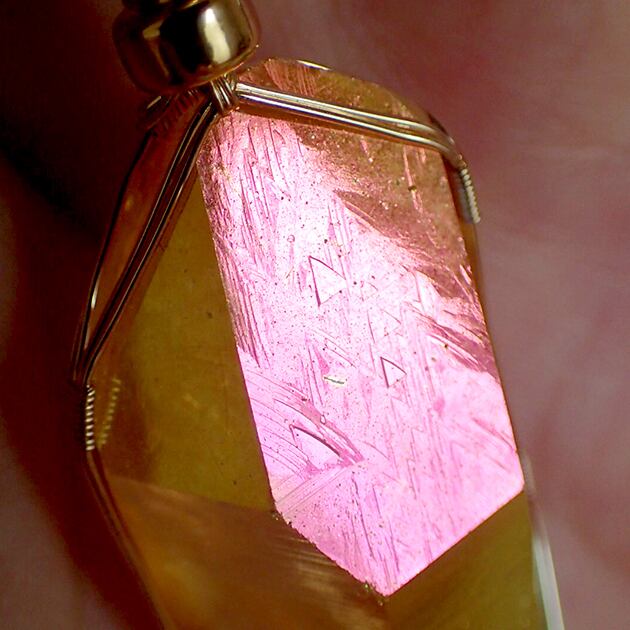 クリスタル上部の断面には、うっすらと『レコードキーパー』と呼ばれる三角形の凸模様が見えます。この一律な方向を向いた三角形には、古代アトランティス、レムリアの叡智が記憶されているといわれています。