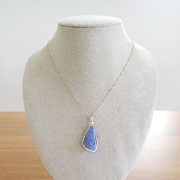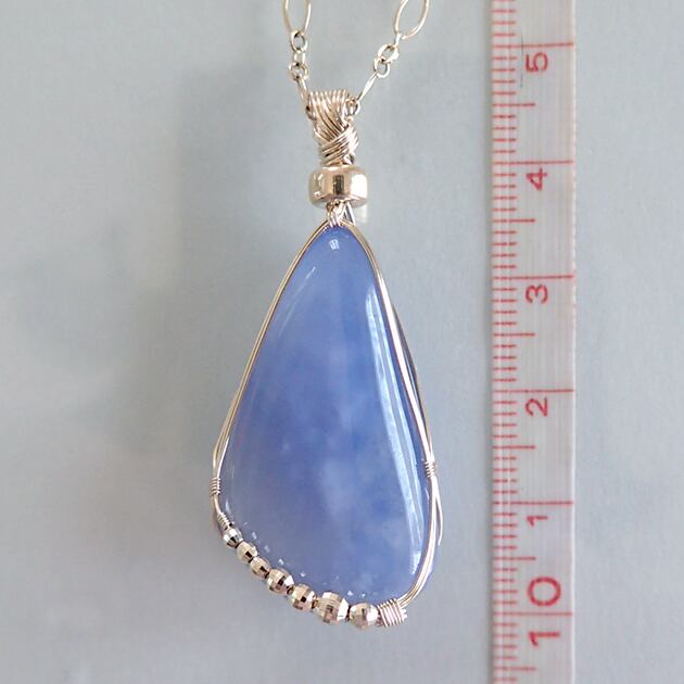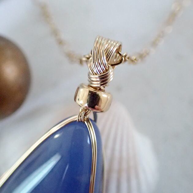 ブルーカルセドニーの滑らかなタンブルを〈女神巻き®〉デザインでペンダントトップにお創りしました。雨に濡れたアジサイのようにしっとりと艶やかです。