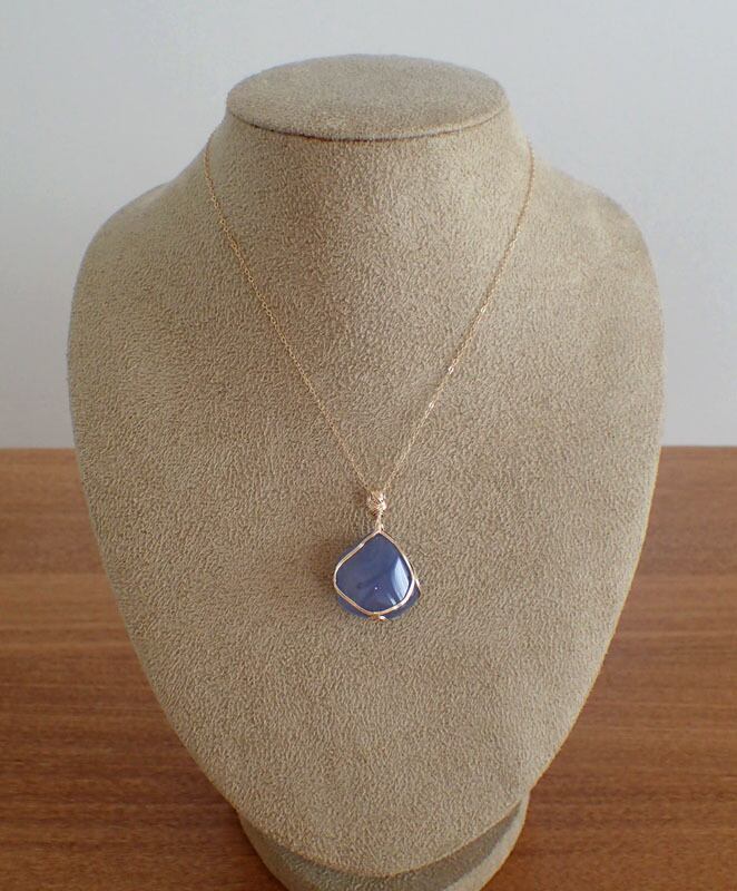 ご覧になってくださり、ありがとうございます。夕暮れ時の空を思わせる、しっとりとした色味のブルーカルセドニータンブルを、繊細な〈女神巻き〉デザインでペンダントトップにしました。14金ゴールドフィルドワイヤーを使用しています。(※ネックレスチェーンは別売りです)