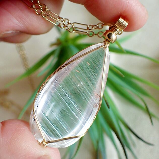 レムリアン・リッジを残したまま研磨された、非常に珍しいカボションを〈女神巻き®〉デザインでペンダントトップにしました。