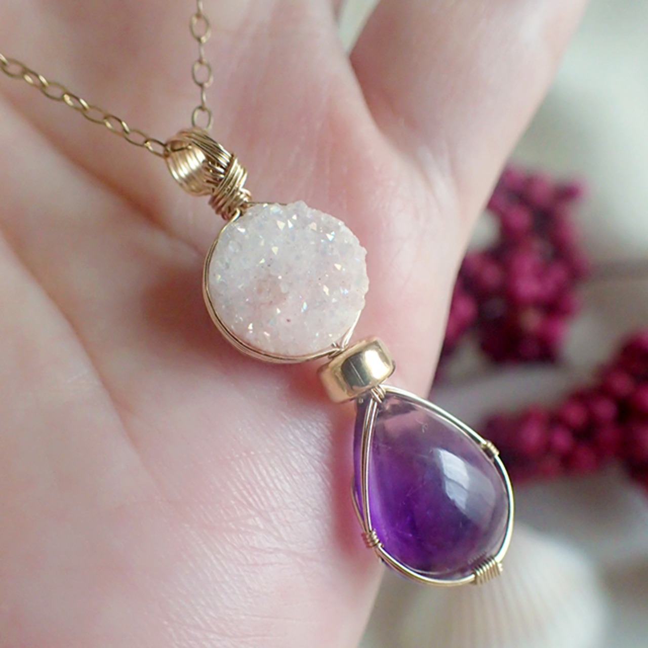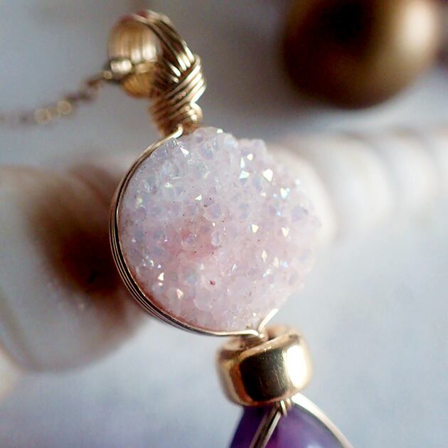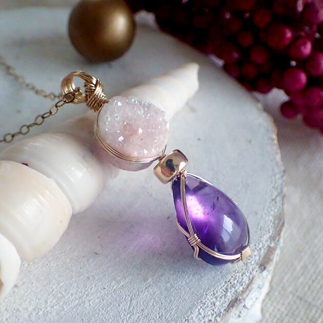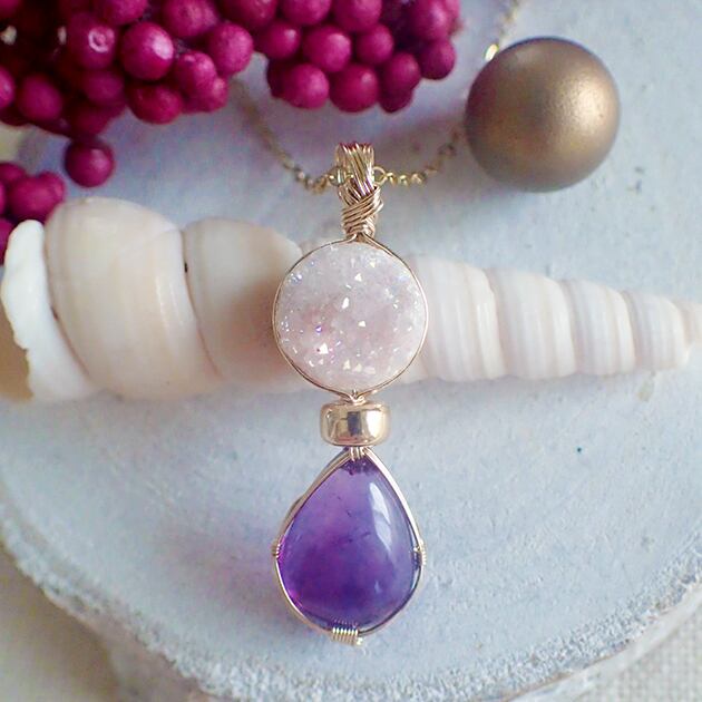 キラキラと輝く砂糖菓子のようなドゥルージーアゲートのビーズと、雫型のアメジストを組み合わせて、小さな〈女神巻き®〉ツイン・ペンダントトップにお創りしました。