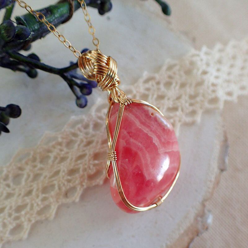 ご覧になってくださり、ありがとうございます。ロードクロサイト(インカローズ)のタンブルを、繊細な〈女神巻き〉デザインでペンダントトップにしました。14金ゴールドフィルドワイヤーを使用しています。(※ネックレスチェーンは別売りです)