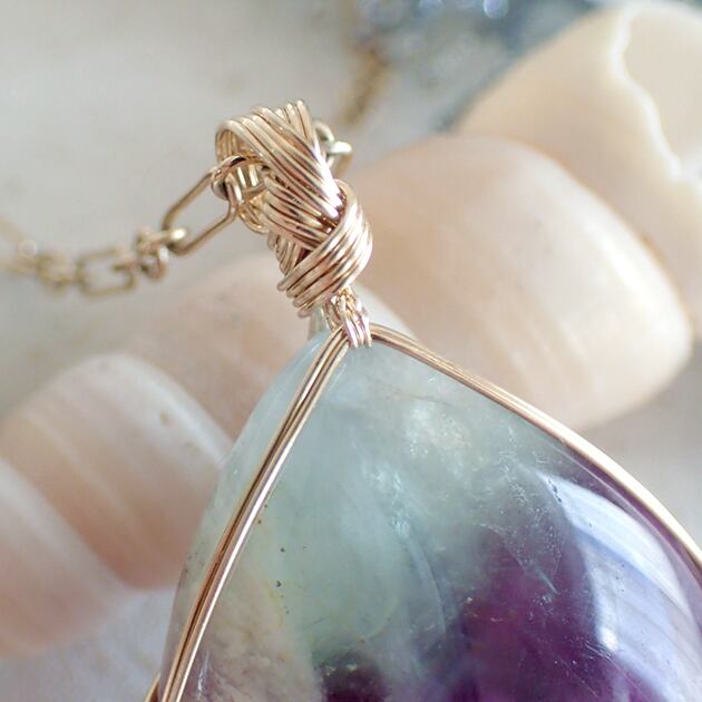 エンジェルフェザー・フローライトの雫型カボションを女神巻き®ジュエリーにお創りしました。