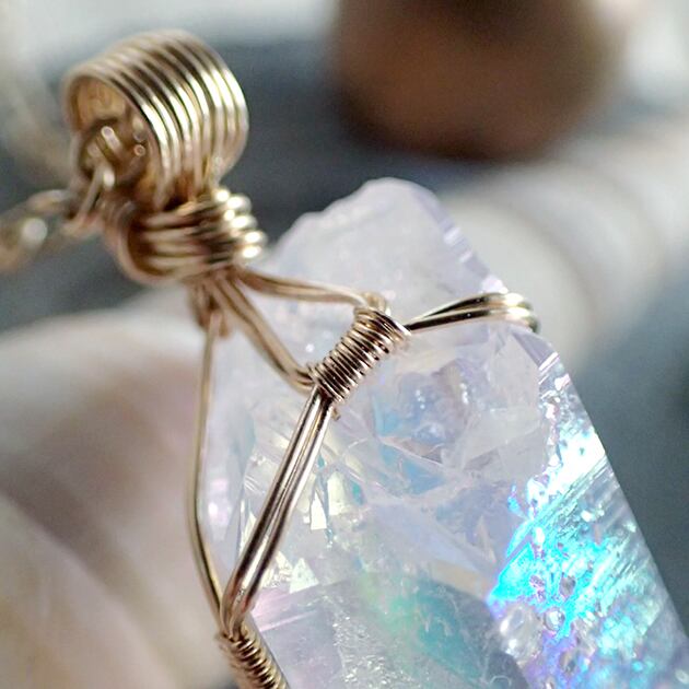 ポイント型のエンジェルオーラ・クォーツを女神巻き®ジュエリーにお創りしました。