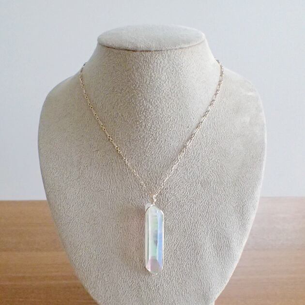 虹を帯びて白く輝く姿は、天使そのもののようです。ポイント型なので、不調な時は手に握ってマイナスエネルギーをアースしたり、ペンジュラムのようにしてメッセージを受け取ることもできます。