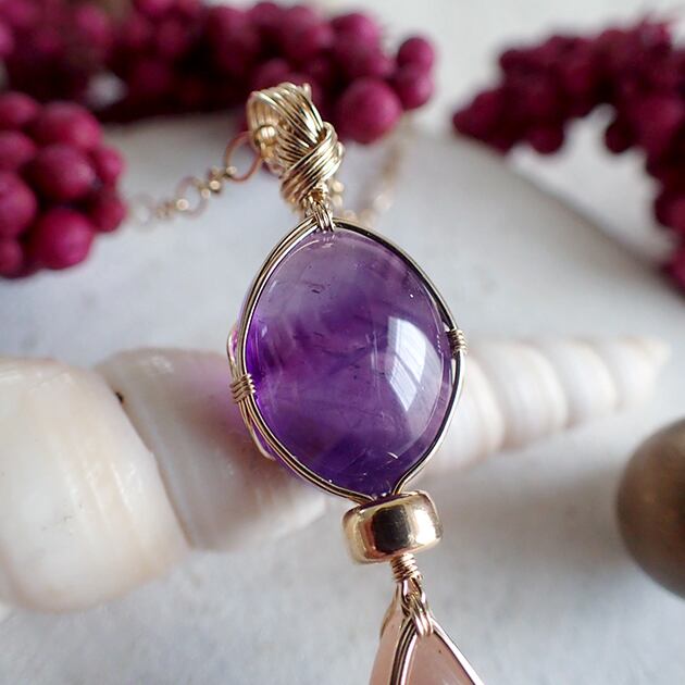【Cosmic Jam】〈女神巻き®〉アメジストとオレンジムーンストーンのツイン・ペンダントトップ