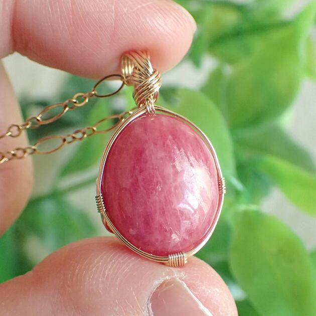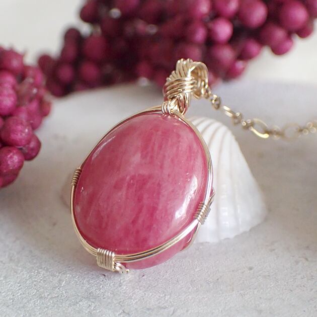 ロシア産ロードナイトのオーバル型カボションを、女神巻き®ペンダントトップにお創りしました。