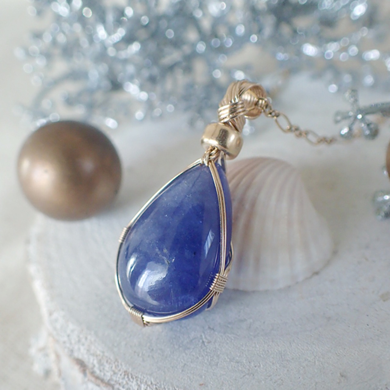 タンザニア産タンザナイトのドロップ型カボションを、女神巻き®ペンダントトップにお創りしました。