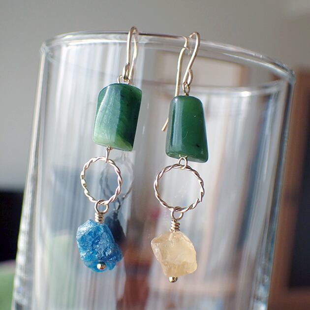 〈14kgf〉ネフライトと原石ビーズ(ブルーアパタイト、シトリン)のピアス