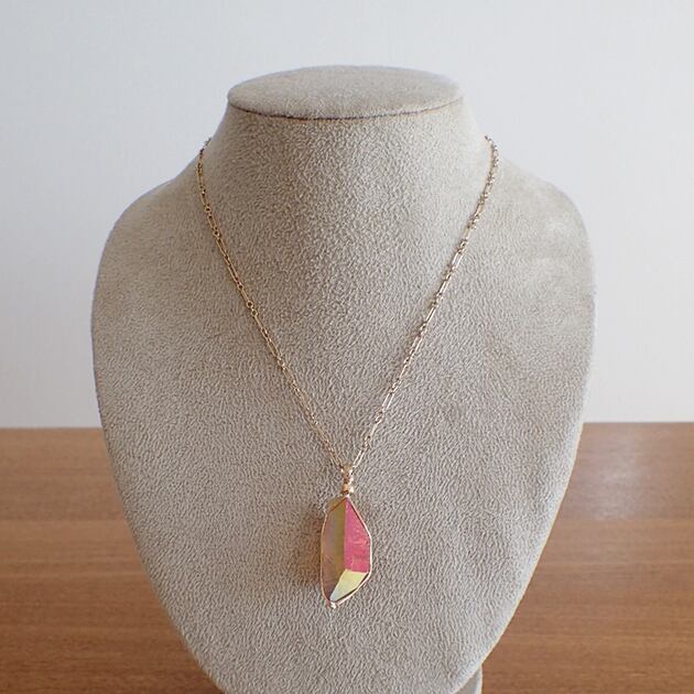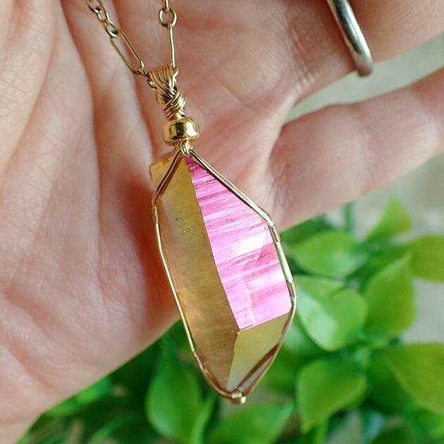 ・オーラ色の蒸着加工を施されたポイント型水晶です。