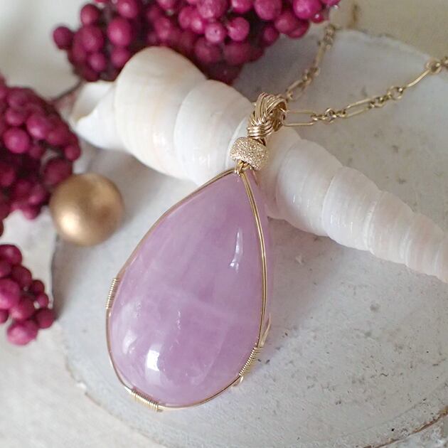 大粒のクンツァイトを〈女神巻き®〉デザインでペンダントトップにお創りしました。