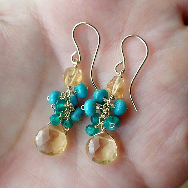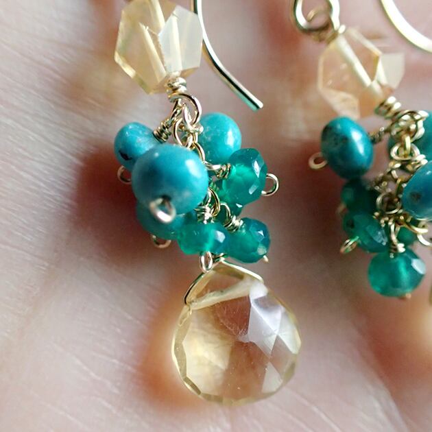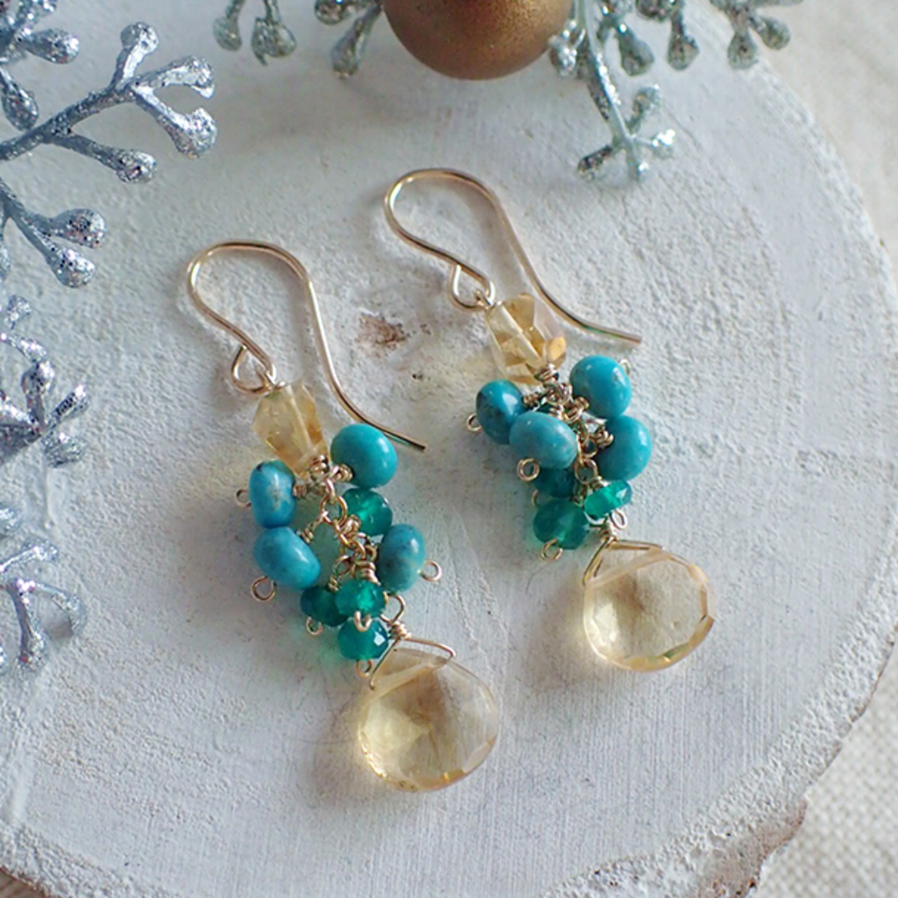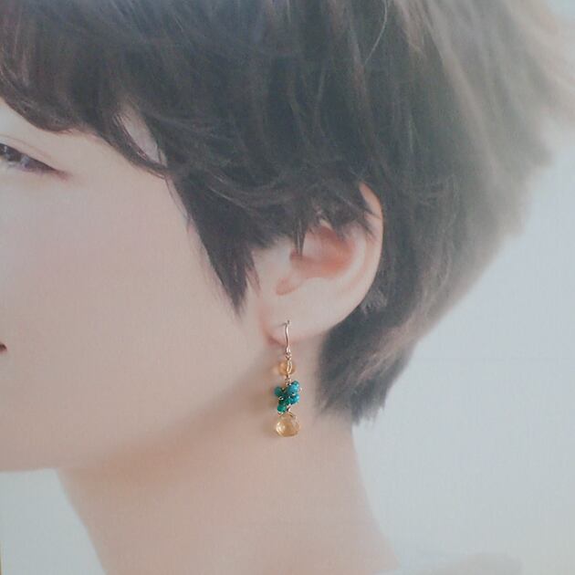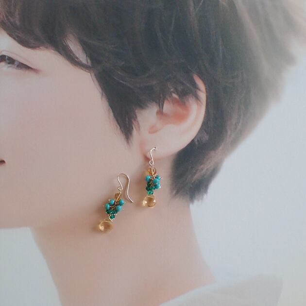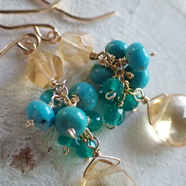 宝石質のシトリンと小粒のターコイズ、グリーンオニキスでピアスをお創りしました。(※イヤリングへの変更も可。詳細は後述)