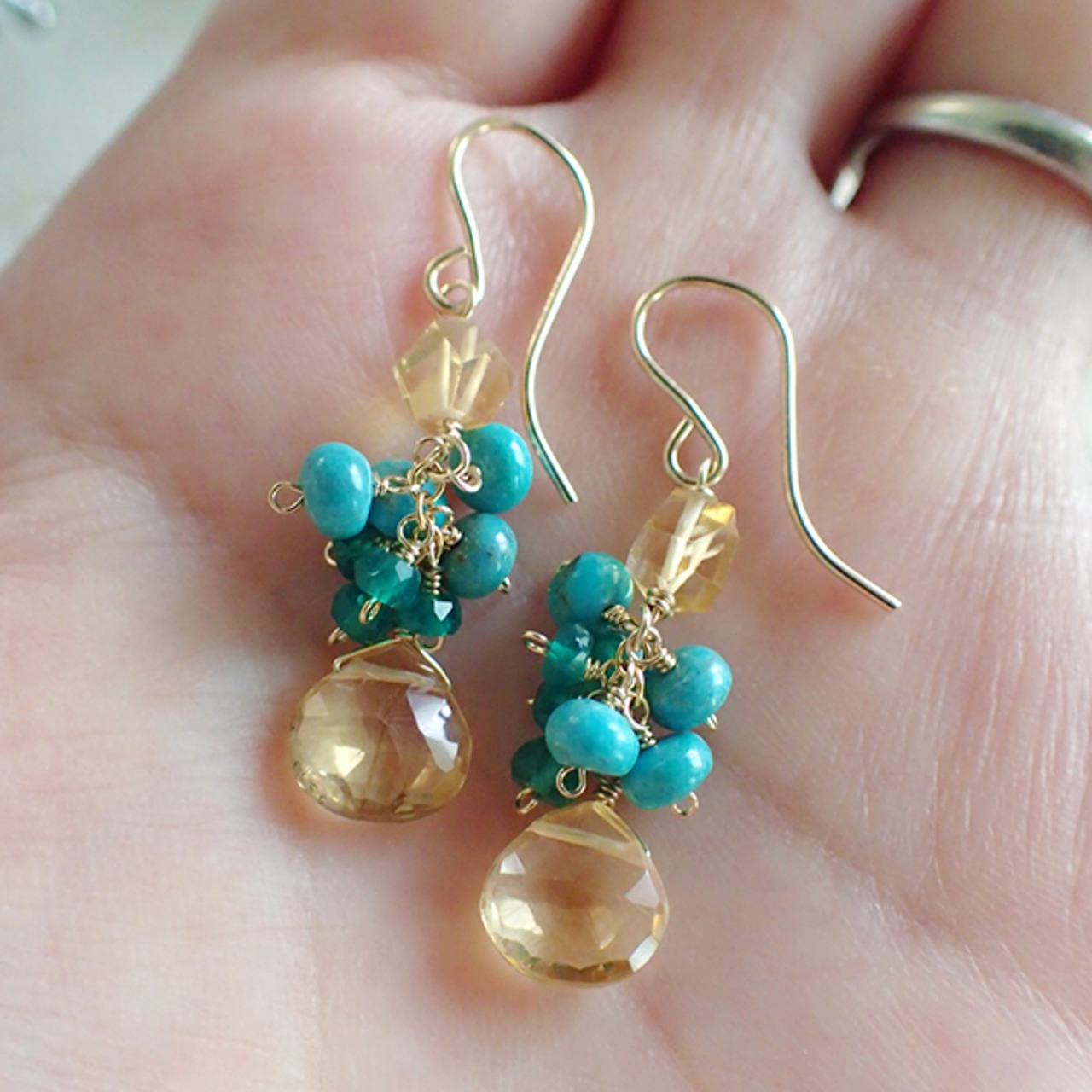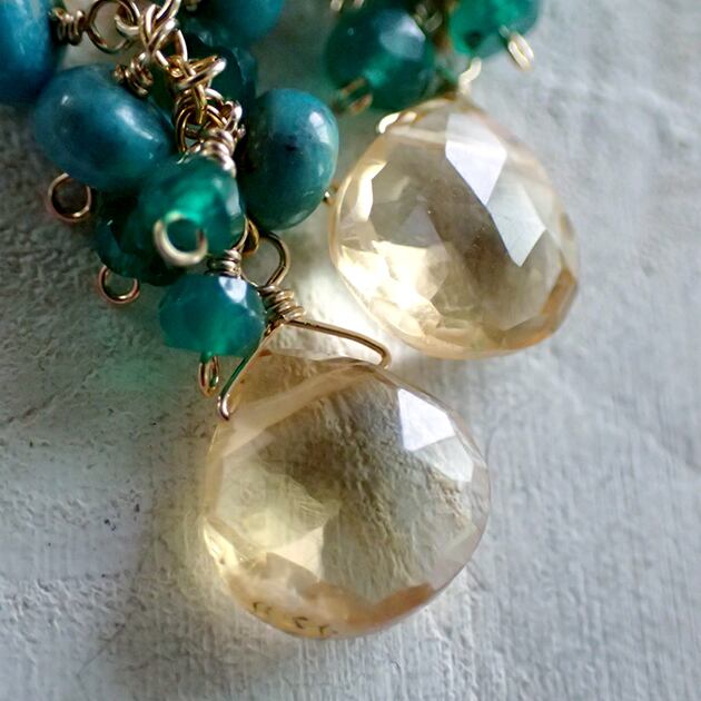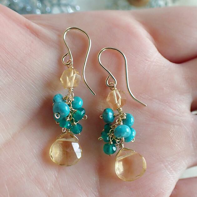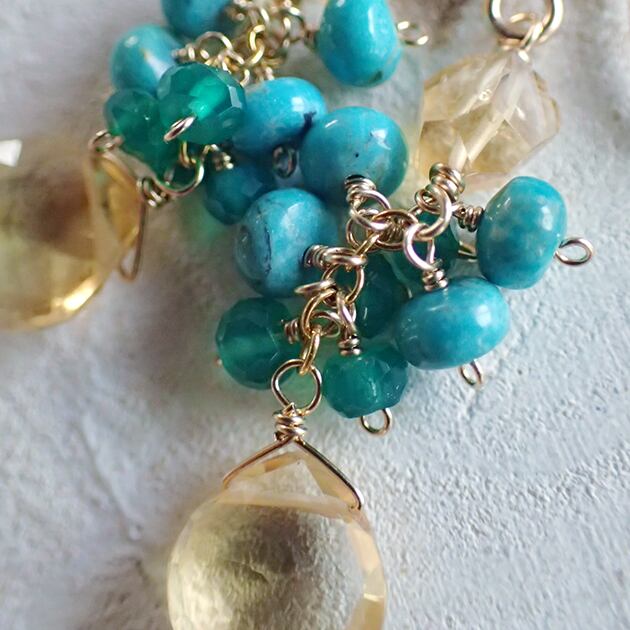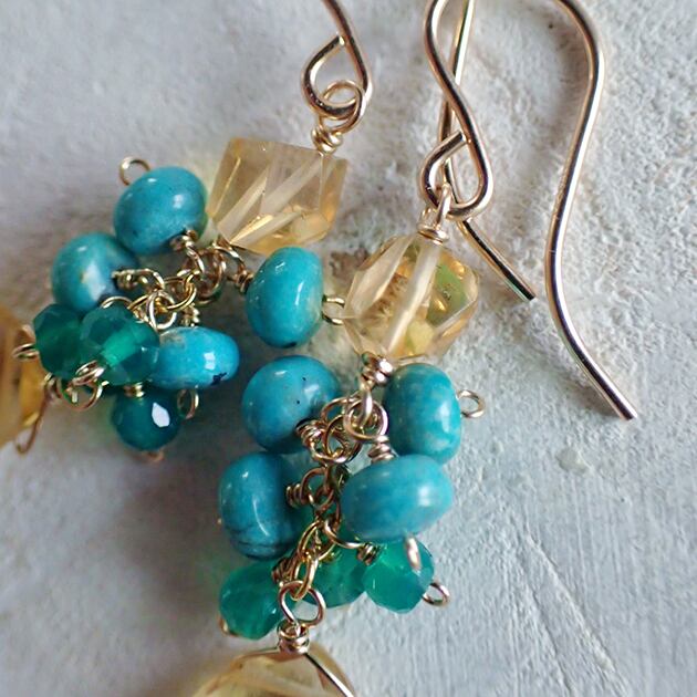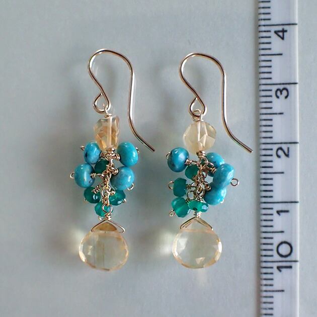 宝石質のシトリンと小粒のターコイズ、グリーンオニキスでピアスをお創りしました。(※イヤリングへの変更も可。詳細は後述)