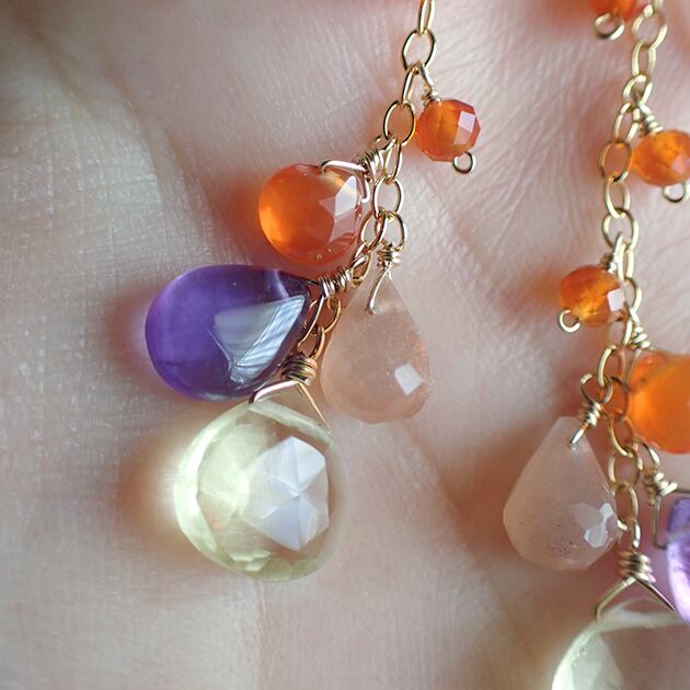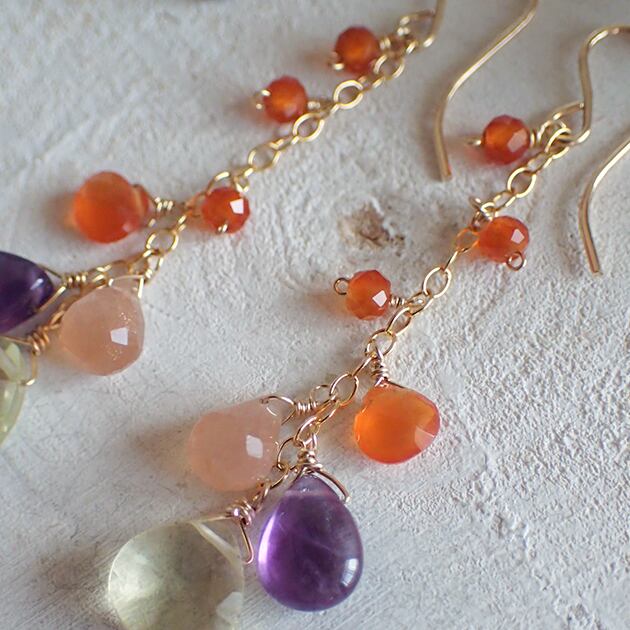 マロン型のレモンクォーツとカーネリアン、他にも彩り豊かな石を合わせてピアスをお創りしました。