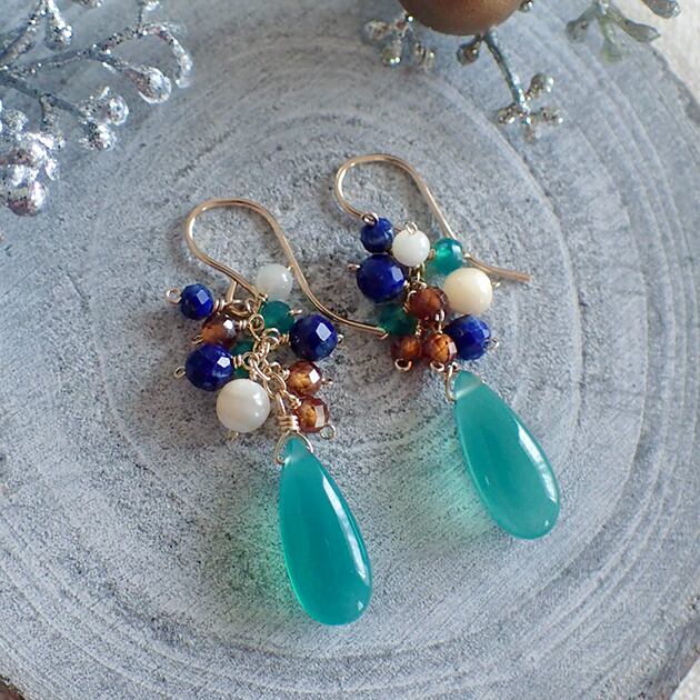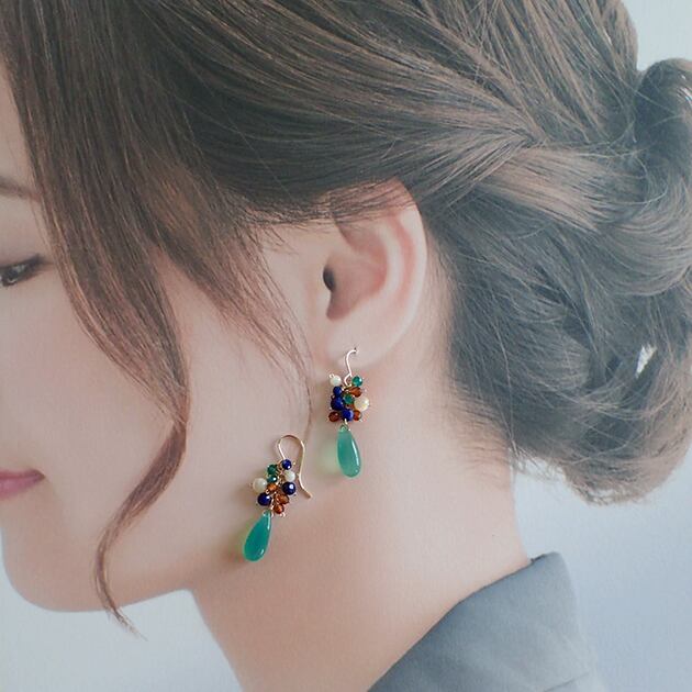 プレーンなグリーンオニキスに渋めな色味の小粒石をたくさん合わせて、ピアスにお創りしました。