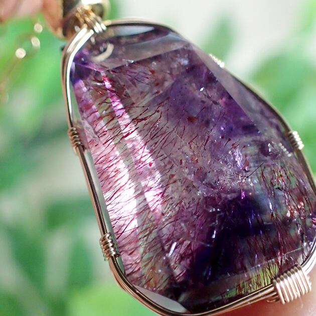 高品質で美しいタンブルカットのスーパーセブン(アメジストエレスチャル)を〈女神巻き®〉デザインでペンダントトップにお創りしました。