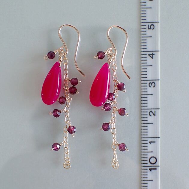 ドキッとするほど鮮やかなフューシャーピンク・カルセドニーに、小粒のガーネットをたくさんあしらったピアスをお創りしました。