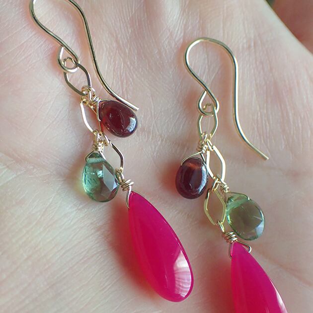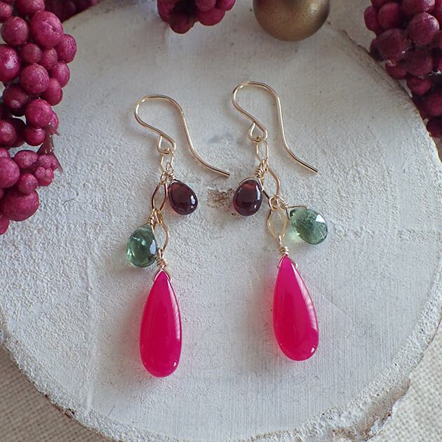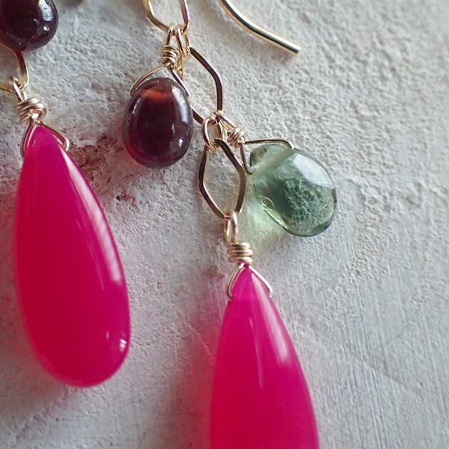 鮮やかなフューシャーピンク・カルセドニーと、スモーキーな色味のガーネット、グリーンアパタイトを組み合わせてピアスをお創りしました。