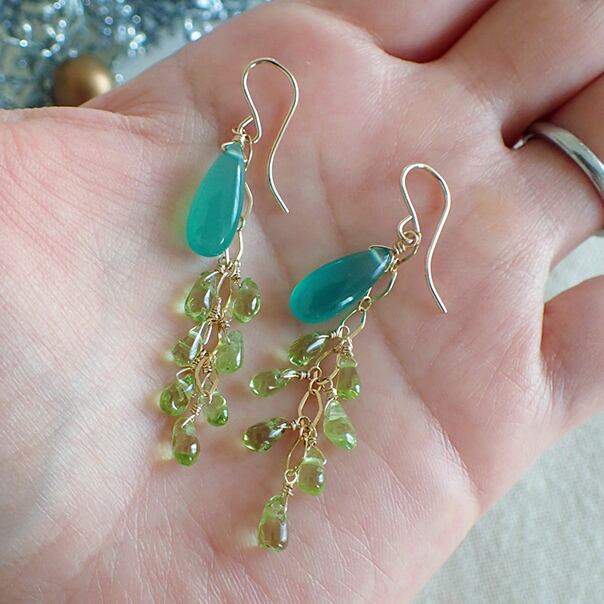 つるんとなめらかなグリーンオニキスに、小粒の宝石質ペリドットをたくさんあしらったピアスをお創りしました。