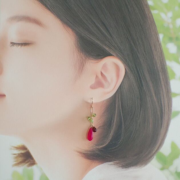 鮮やかなフューシャーピンク・カルセドニーに、ボタンカットのペリドット、まあるいフォルムのガーネットをあしらったピアスをお創りしました。