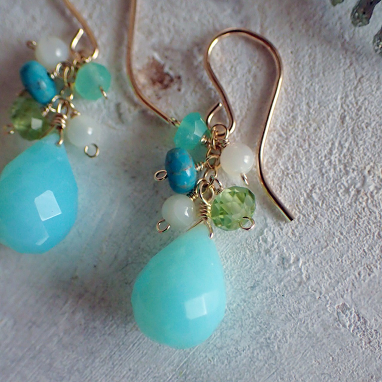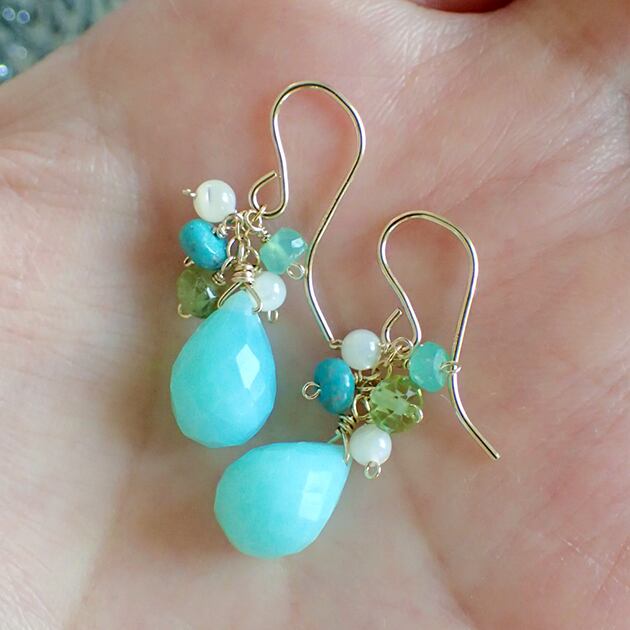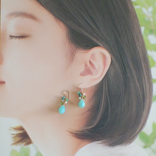 シャーベットみたいに爽やかなブルーオパールに、様々な彩りの小粒石を合わせてピアスをお創りしました。