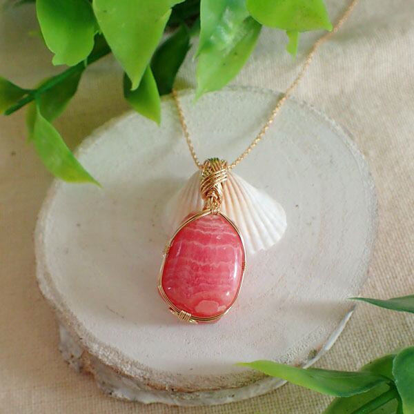 ご覧になってくださり、ありがとうございます。しましま模様の愛らしいロードクロサイト(インカローズ)のタンブルを〈女神巻き〉デザインでペンダントトップにしました。14金ゴールドフィルドワイヤーを使用しています。(※ネックレスチェーンは別売りです)