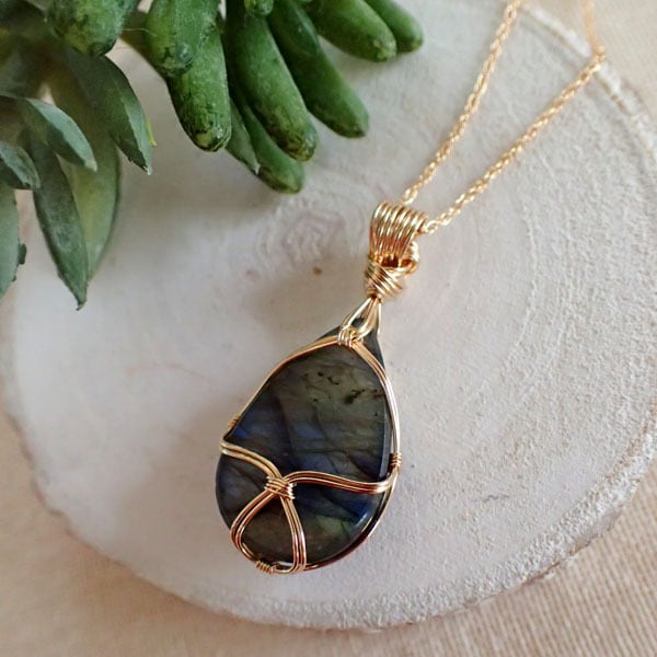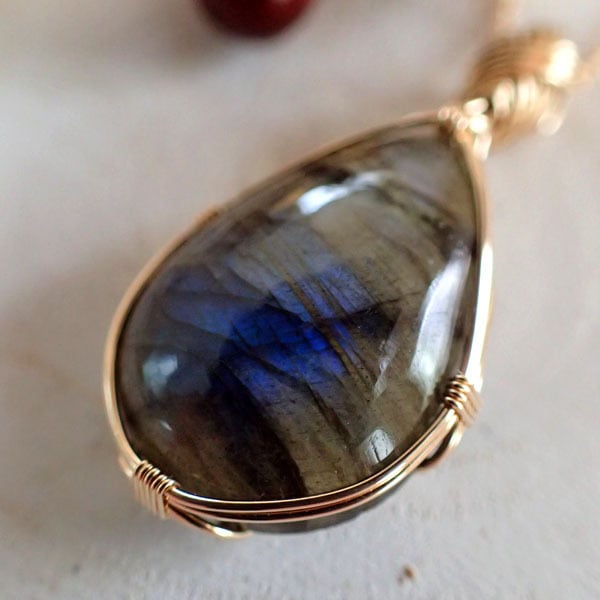 ご覧になってくださり、ありがとうございます。ラブラドライトのドロップ型カボションを、〈女神巻き〉デザインでペンダントトップにしました。14金ゴールドフィルドワイヤーを使用しています。(※ネックレスチェーンは別売りです)