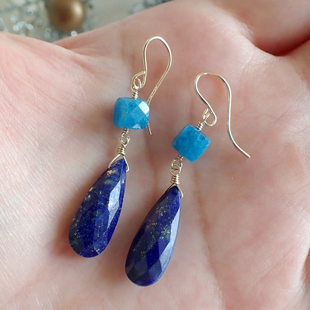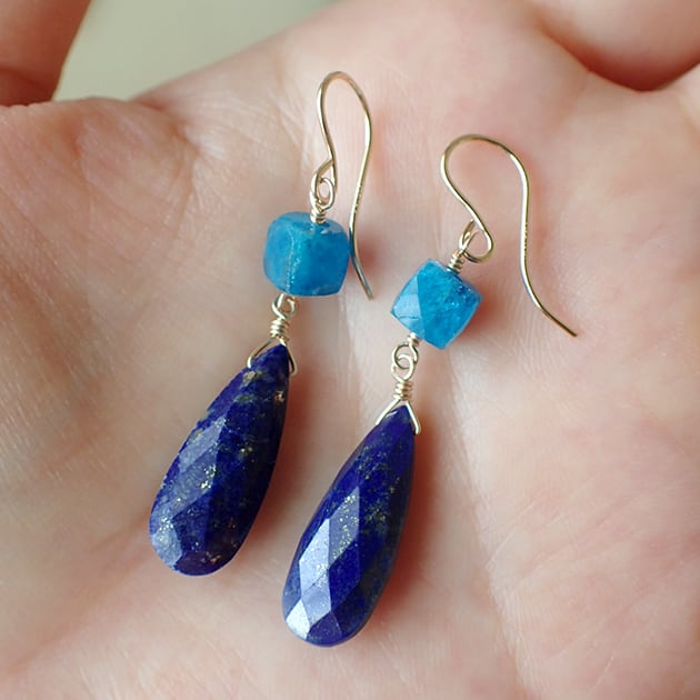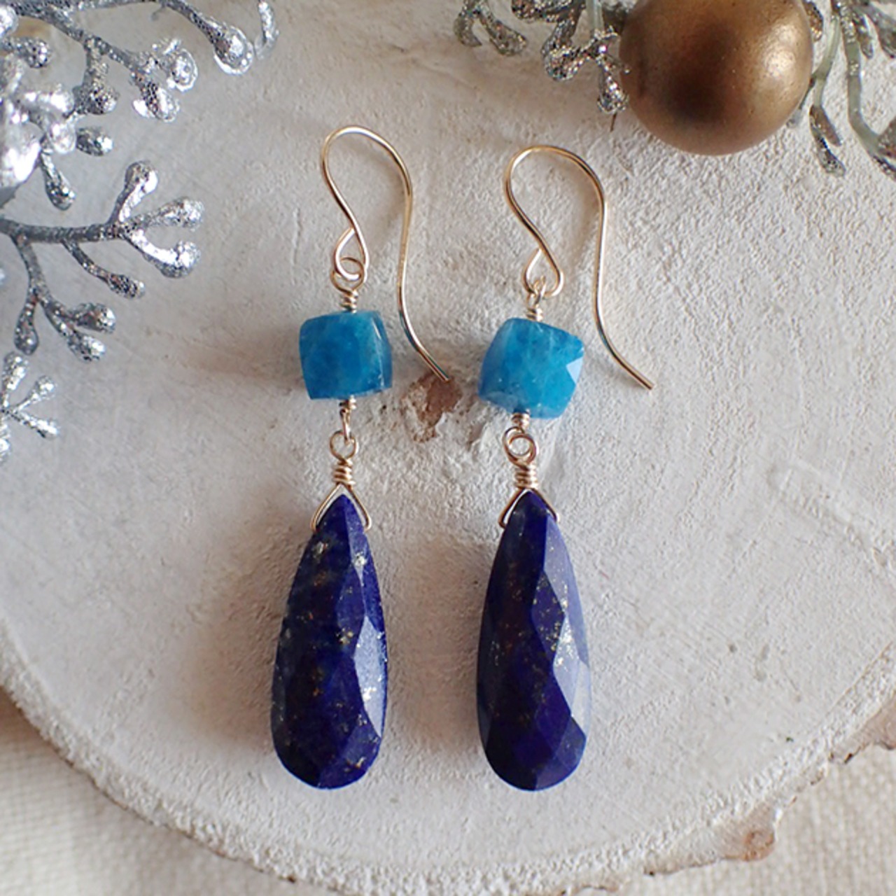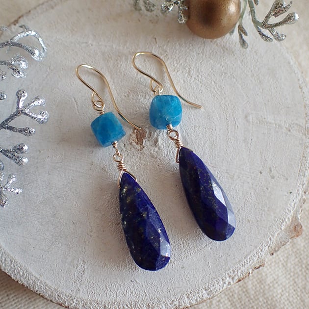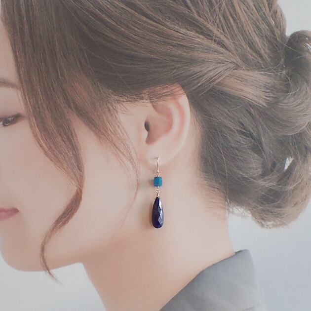 縦に長いラピスラズリと、キューブ型のブルーアパタイトを組み合わせてピアスをお創りしました。