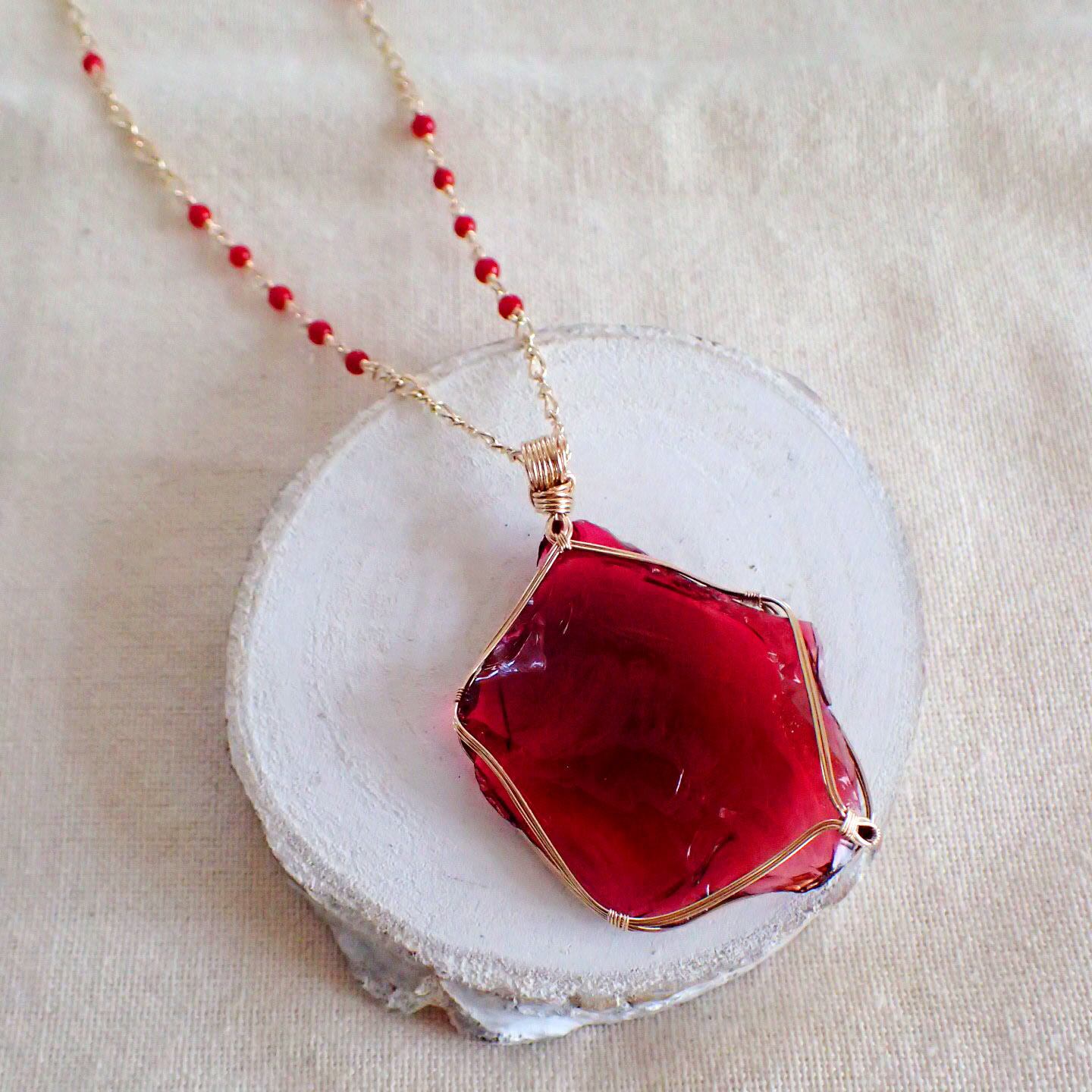 ご覧になってくださり、ありがとうございます。大きなサイズで、力強い印象の赤いアンダラクリスタルを、〈女神巻き〉デザインでペンダントトップにしました。付属のロングネックレスチェーンには珊瑚をたっぷりとあしらいました。14金ゴールドフィルドワイヤーを使用しています。