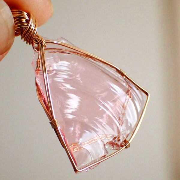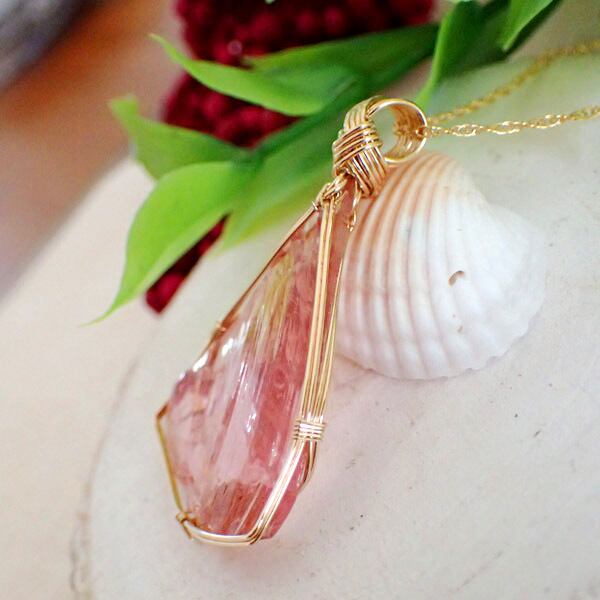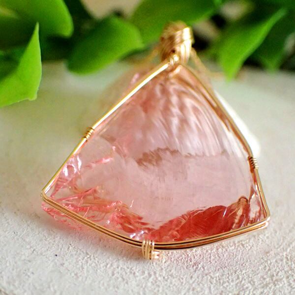 ご覧になってくださり、ありがとうございます。薄く張った氷のように繊細なピンクのアンダラクリスタルを、〈女神巻き〉デザインでペンダントトップにしました。14金ゴールドフィルドワイヤーを使用しています。(※ネックレスチェーンは別売りです)